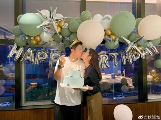 사진 속 부부는 화려한 생일 풍선 장식 앞에서 케이크를 들고 다정한 포즈를 취했다.