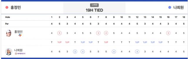 -UP(승) DN(패) U(홀포기 승) X(홀포기) H(홀 동률) Tie(A/S)(코스동률) n & n(승수&남은홀수) n Holes(연장홀수)
