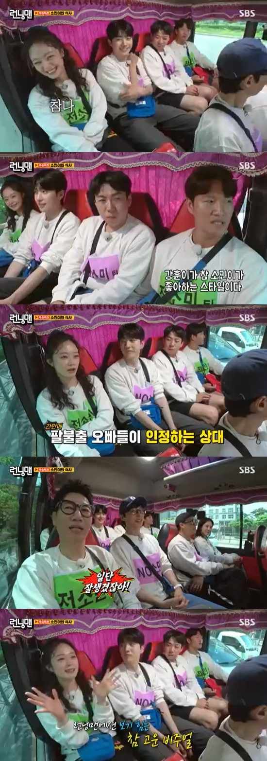 이후 '런닝맨' 멤버들과 조세호, 강훈은 버스를 타고 미션 장소로 이동했다. 이 때 조세호는 "소민이가 강훈이 옆에 앉으니 조용하네"라고 평소와는 달리 얌전하게 있는 전소민을 언급했고, 김종국은 "강훈이가 소민이가 정말 좋아하는 스타일이야"라고 거들었다.
