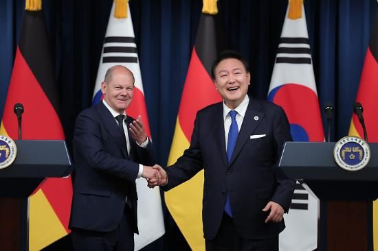 21日,韩国总统尹锡悦与德国总理奥拉夫·肖尔茨在首尔龙山总统室举行韩德首脑会谈联合记者会后,笑容满面地握手致意,并彰显了韩德两国的友好关系。