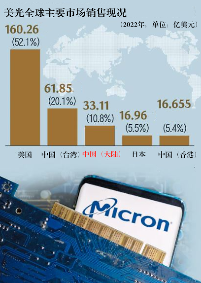 中国网信办在今年3月宣布,将对美光公司在华销售产品实施网络安全审查,美光当时回应称,将与网信办进行积极沟通并全力配合。预计此次中方禁令将令美光遭受不小的损失,中国大陆是继美国和中国台湾之后,美光的第三大市场,去年美光在华销售额超过4万亿韩元(约合人民币209亿元),占公司销售总规模的11%。中方宣布对美光实施制裁当天,美光股价应声下跌4.36%。
