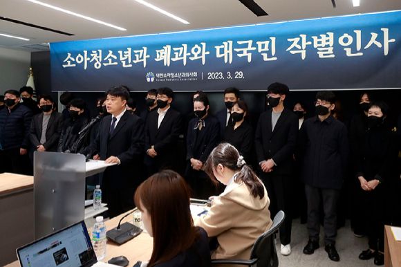 임현택 대한소아청소년과의사회 회장이 29일 서울 용산구 대한의사협회에서 소아청소년과 폐과와 대국민 작별인사 기자회견을 하고 있다. [사진=뉴시스]