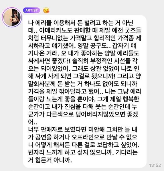 또 "너무 판매자로 보였다면 미안하다. 그치만 늘 내가 공연을 하거나 오프라인으로 만날 수 없으니 어떻게 해서든 다른 걸로 보답하고 싶었다"며 진심을 털어놨다.