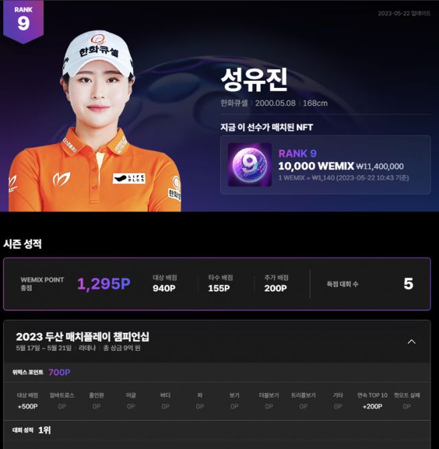 이번 우승으로 성유진은 '위믹스 포인트'에서 대상 배점 500점과 연속 톱10 배점 200점을 추가로 획득했다. 그 결과 지난주보다 순위가 9계단 상승한 9위에 이름을 올렸다.