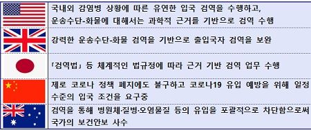 최근 공중보건비상사태에 대비하고, 자국민의 건강을 보호하기 위한 검역정책에 대한 국제적 요구가 코로나19를 계기로 증가하고 있다.