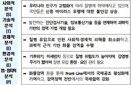 한편 검역은 최일선에서 해외로부터 질병의 유입과 확산을 예방하여 국민의 건강뿐만 아니라 사회적·경제적 피해를 예방하기 위한 중요한 조치로서 사회적 인식이 강화되고 있다.