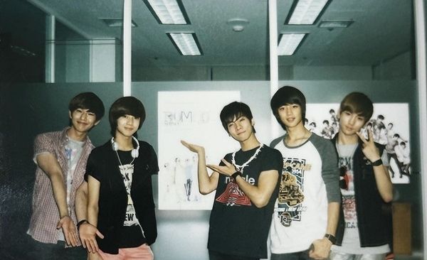 데뷔 초 멤버들과 포즈 취하고 있는 고 종현
