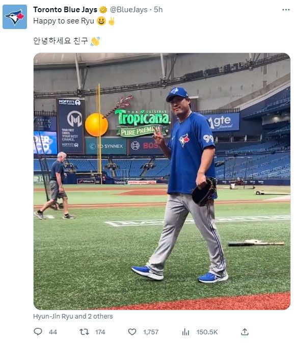 토론토 구단도 공식 트위터에 류현진이 트로피카나필드에서 '브이'(V) 포즈를 하는 영상을 올리고 한국어로 "안녕하세요 친구"라고 적었다.