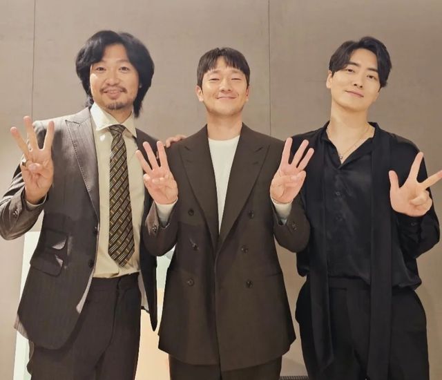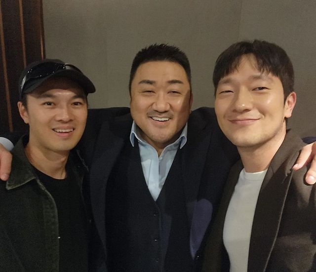 공개된 사진에는 손석구가 전날 영화 '범죄도시3' 시사회에 참석해 뒤풀이 자리에서 이상용 감독을 비롯한 마동석, 이준혁, 아오키 무네타카 등과 함께 사진을 찍은 모습이 담겨 있다.