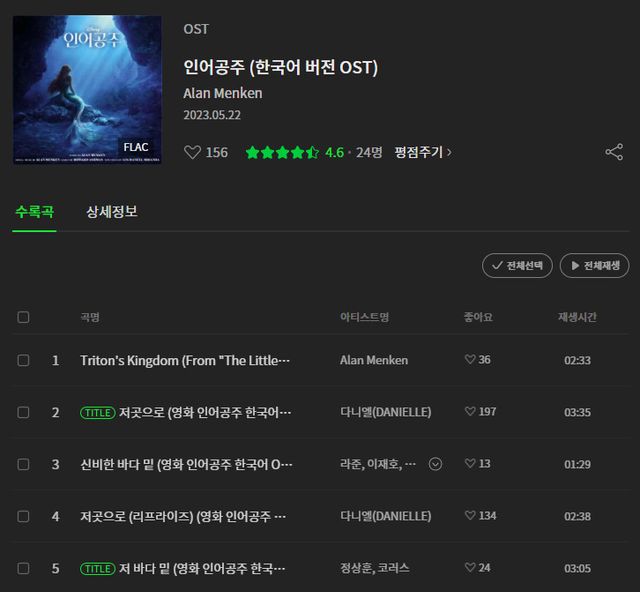 지난 22일 공개된 영화 '인어공주' 한국어 버전 OST / 음원 사이트 '멜론'