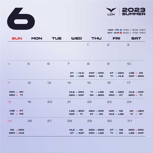 서머 스플릿의 정규 리그는 오는 6월 7일 오후 5시 서울 종로구 롤파크에 위치한 LCK 아레나에서 KT 롤스터와 한화생명e스포츠, 디플러스 기아와 리브 샌드박스의 대결로 포문을 연다.