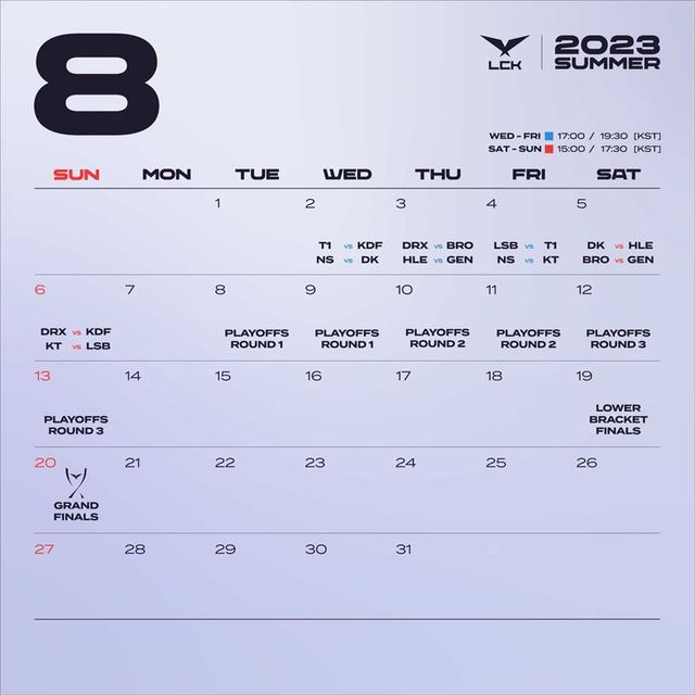 MSI에 출전했던 젠지와 T1은 각각 금요일 1,2경기에 출전하며, 일요일에는 두 팀간의 대결이 예정돼 있다.