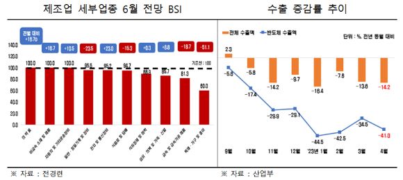 6월 업종별 BSI는 제조업(90.9)과 비제조업(90.9) 모두 2022년 6월부터 13개월 연속 기준선 100을 하회하며 동반 부진했다. 제조업과 비제조업이 13개월 연속 동반 부진한 것은 2019년 9월 이후 처음이다.
