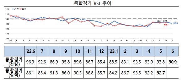 23일 전국경제인연합회가 매출액 기준 600대 기업을 대상으로 기업경기실사지수(Business Survey Index)를 조사한 결과, 6월 BSI 전망치는 90.9를 기록했다. BSI가 100보다 높으면 전월대비 긍정적 경기 전망, 100보다 낮으면 전월대비 부정적 경기 전망을 뜻한다.