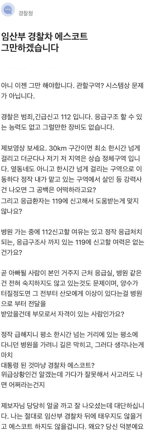 지난 22일 직장인 커뮤니티 블라인드에는 '임산부 경찰차 에스코트 그만하겠습니다'라는 제목 글이 올라왔다.