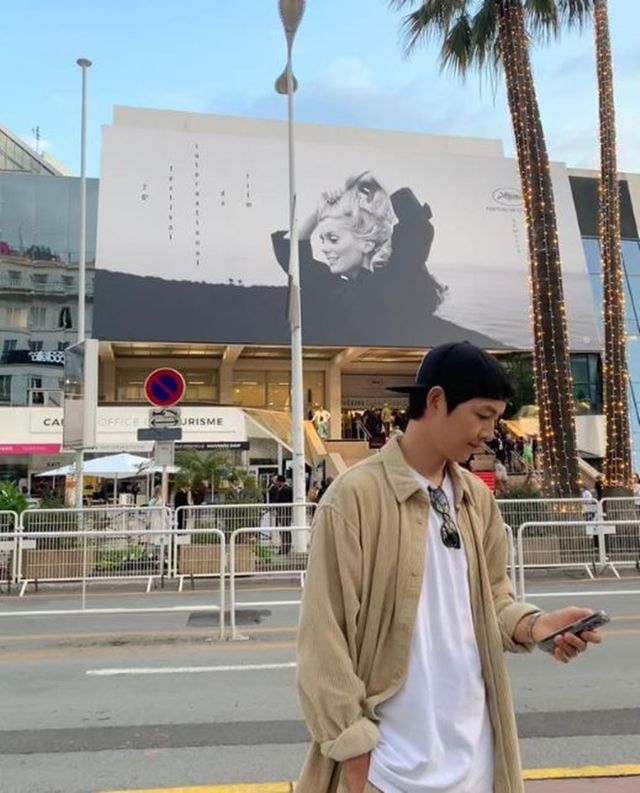 송중기가 한글로 '화란'이라고 적힌 모자를 쓰고 프랑스 남부 칸 거리를 걷고 있다.