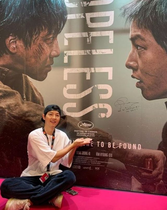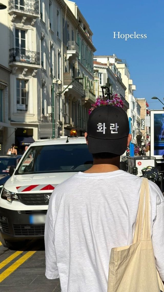송중기는 지난 23일 자신의 인스타그램 스토리에 "Hopeless"라는 글과 함께 프랑스 남부 칸에서 찍은 사진을 한 장 게시했다. 사진에는 송중기가 한글로 '화란'이라고 적힌 모자를 쓰고 있는 모습이 담겨 눈길을 끌었다.