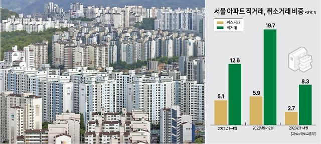 취소 거래 비중 또한 큰 폭으로 낮아졌다. 올해 4월까지 서울 지역 아파트 취소 거래는 264건 발생했는데 이는 전체 거래 중 2.7%에 해당한다. 지난해 9~12월(5.1%)과 올해 1~4월(5.9%)과 비교하면 절반 수준이다.