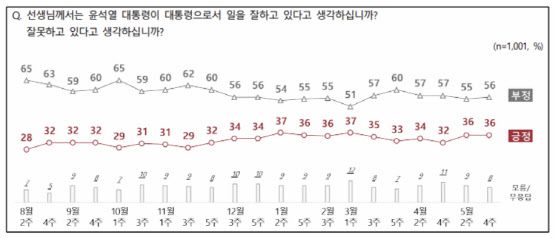 엠브레인퍼블릭, 케이스탯리서치, 코리아리서치, 한국리서치가 지난 22일부터 24일까지 전국 만 18세 이상 남녀 1001명을 대상으로 조사한 결과 윤 대통령의 국정운영을 긍정적으로 평가한 응답 비율은 36%로 집계됐다. 윤 대통령은 직전 조사에서도 36%를 기록했다. 반면 부정적인 평가는 1%포인트 상승한 56%로 나타났다.