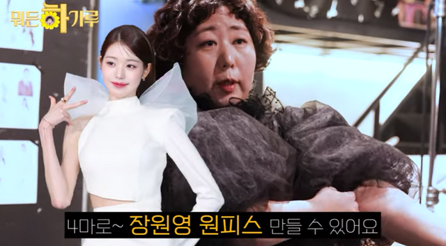 이 옷에 대해 그는 "'한도초과'에서 입어서 좀 화제가 됐다. 60마 드레스라고 팔에만 40마가 들어간다. 4마로 장원영 원피스 만들 수 있다. 전체로 아이브 멤버 (옷) 다 만들 수 있다"고 말했다.