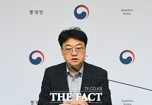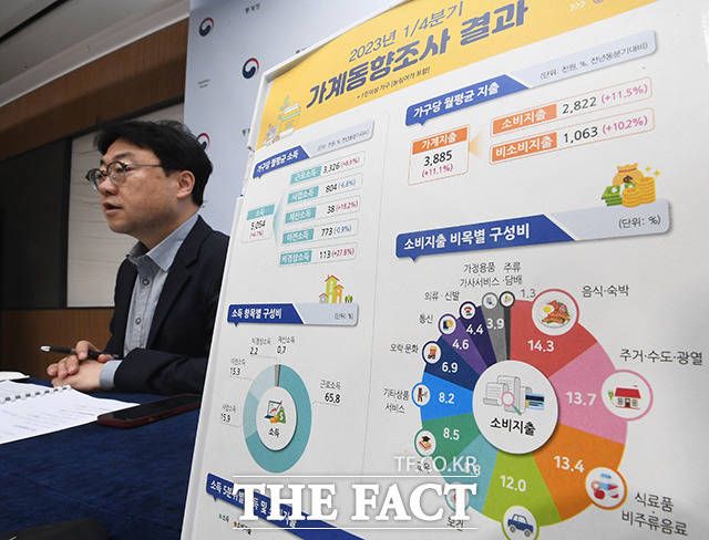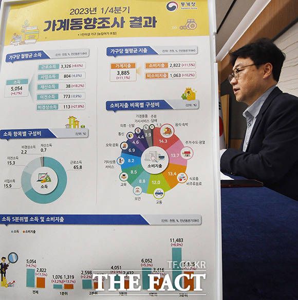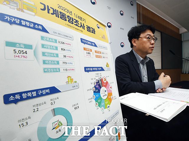 [더팩트ㅣ세종=이동률 기자] 이진석 통계청 가계수지동향과장이 25일 오전 세종시 정부세종청사 중앙동에서 2023년 1/4분기 가계동향조사 결과를 발표하고 있다.