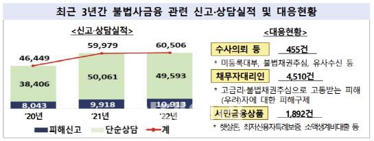 금감원은 지난해 총 6만506건의 불법사금융 관련 피해신고 및 상담을 실시했다. 피해신고는 1만913건, 단순상담이 4만9593건으로 나타났다.