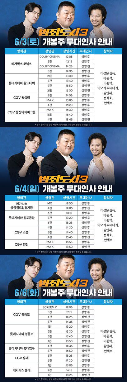 [이데일리 스타in 김보영 기자] 대한민국 대표 범죄 오락 액션 영화 ‘범죄도시3’(감독 이상용)가 3일간의 무대인사를 확정했다.