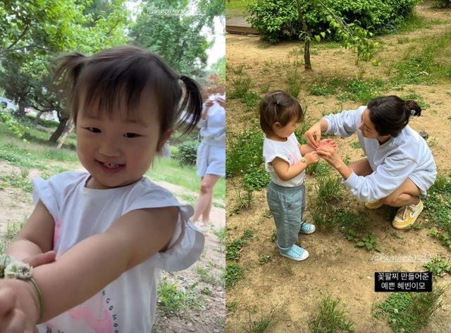 이어진 사진에는 한지혜의 딸이 카메라를 향해 손목에 꽃팔찌를 자랑하고 있다. 특히 한지혜는 "꽃팔찌 만들어준 예쁜 혜빈이모"라는 글과 함께 전혜빈이 한지혜의 딸에게 꽃팔찌를 만들어주고 있는 모습이 공개되어 훈훈함을 자아내고 있다.