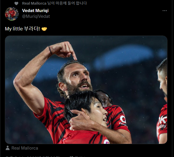무리키는 26일(한국시간) 자신의 트위터에 이강인과 포옹한 뒤 그를 가리킨 사진을 올리며 "My little 부라더!"라고 게시물을 올렸다.