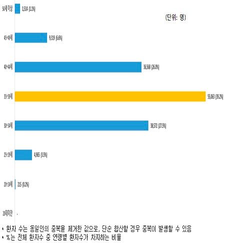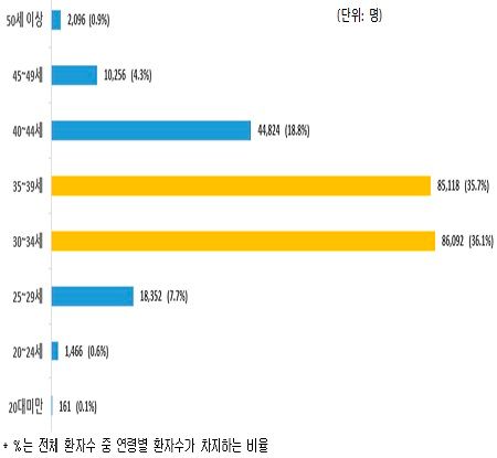 2022년 불임 진료 많은 연령대는 30~34세(8만 6,092명, 전체의 36.1%), 35~39세(8만 5,118명, 전체의 35.7%) 순으로 30대 불임 진료 환자 수가 전체의 71.8%로 나타났다.