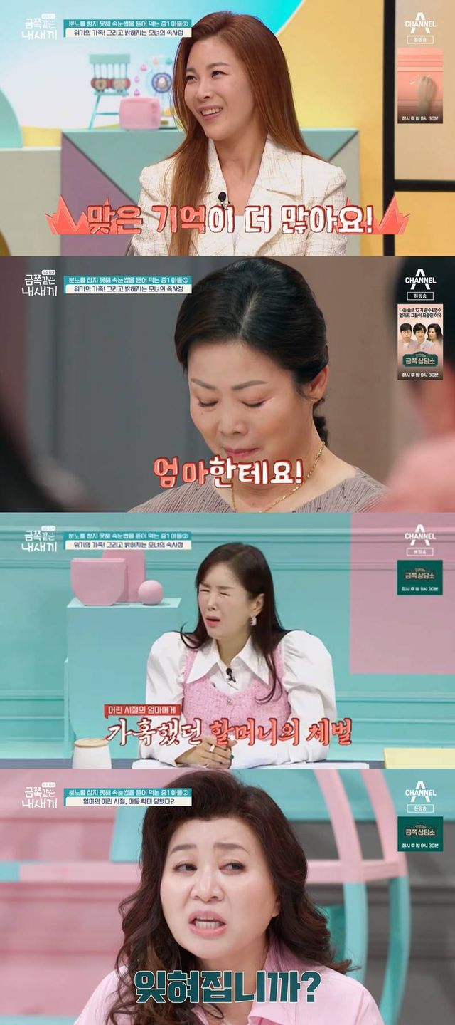 이날 금쪽이의 엄마는 "사실 초등학교 때 맞은 기억이 많다. 많이 맞았다. 엄마한테. 옷도 못 입고 쫓겨난 적도 있고, 종아리 피나게 맞아본 적도 있다"고 자신의 상처를 고백했다.