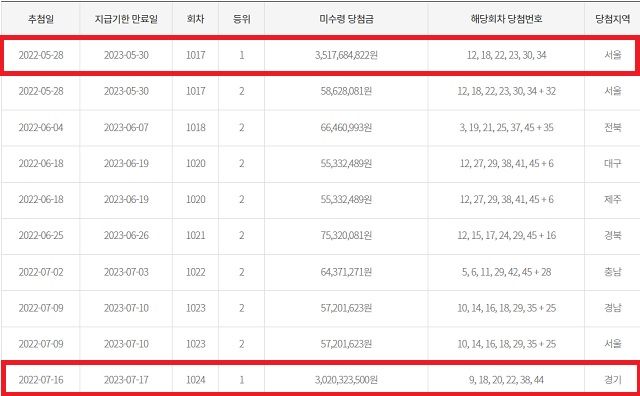 물론 다수인 1016회차와 1007회차, 998회차, 987회차, 924회차, 914회차 1등 당첨금은 국고에 넘어갔다.