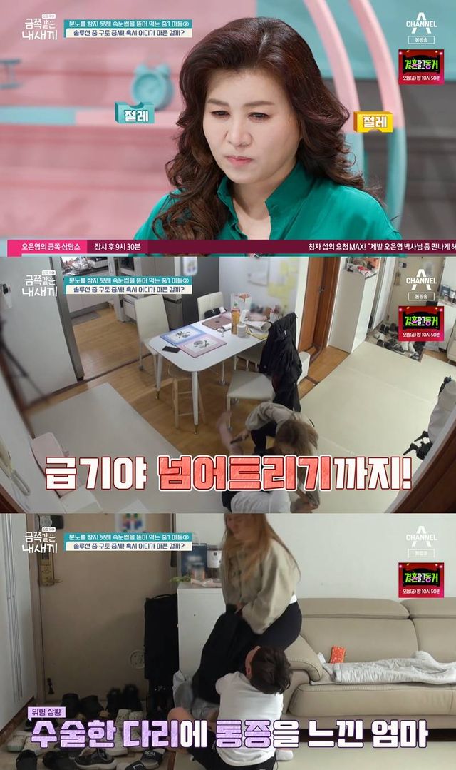 금쪽이는 그래도 엄마가 학원을 가야 한다며 물러서지 않자 엄마를 넘어뜨리고, 다리를 붙잡았다. 그 탓에 엄마는 수술한 무릎에 통증을 느끼고 악 소리를 냈다.