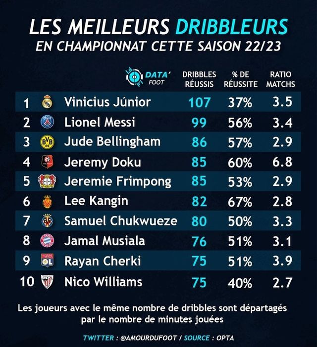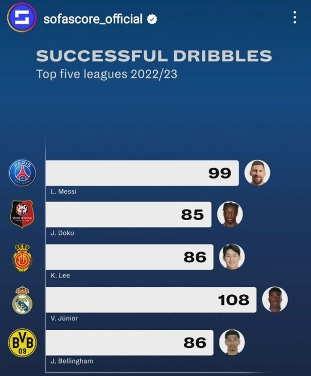유럽 5대 리그로 범위를 넓혀서 봐도 이강인은 드리블 최다 성공 3위를 달리고 있다. 비니시우스에 이어 리오넬 메시(99회)가 위에 있고 주드 벨링엄(86회)과 동률이다.