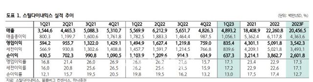 주주친화정책 역시 호재로 작용할 것이란 진단이다. 박 연구원은 “스틸다이내믹스는 올해 1분기 배당금을 전년 동기 대비 25% 확대함과 동시에, 유통 주식 수의 2% 규모인 3억5000만달러의 자사주를 매입했다”며 “올해 남은 기간에도 9억8000만달러의 추가적인 자사주 매입을 발표한 가운데 적극적인 주주환원 정책이 주가에 긍정적으로 작용할 전망”이라고 말했다.