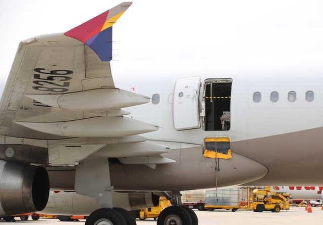 지난 26일 오전 제주에서 대구로 향하던 아시아나 항공기에서 30대 남성이 착륙 전 대구공항 상공에서 비상문을 강제개방하는 사고가 발생해 일부 승객이 병원으로 이송돼 치료를 받고 있다. 이날 오후 비상문이 개방된 채 대구공항에 착륙한 항공기가 계류장에 대기하고 있다. / 이하 뉴스1