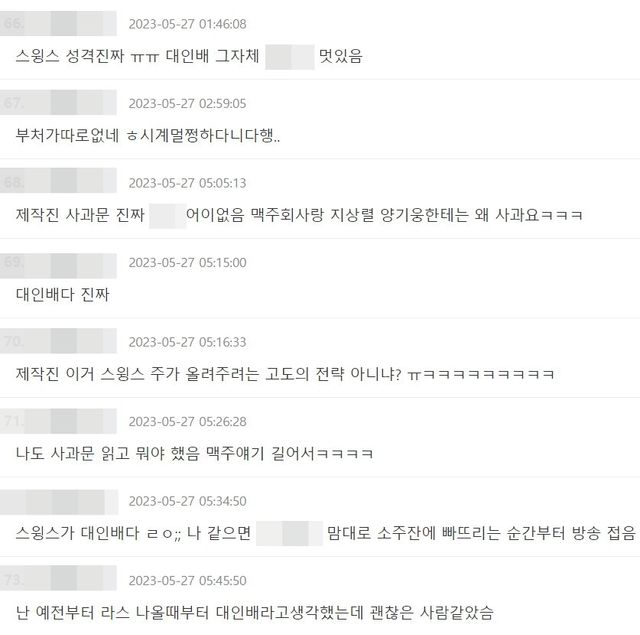 반면 제작진을 향한 불편한 심경은 숨기지 않았다. 스윙스는 "사과하는 태도가 너무 아프다. 사과문을 두 번 올렸는데, 한 번은 맥주 브랜드에 사과했다. 두 번째는 여전히 화가 나 있더라"며 "사과하는 방법을 배워야 할 거 같다"고 일침을 가했다.