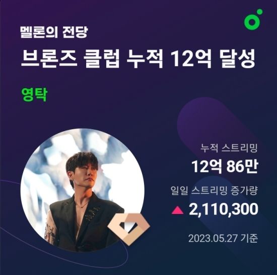 (엑스포츠뉴스 이정범 기자) 영탁의 '멜론' 누적 스트리밍이 12억을 돌파했다.
