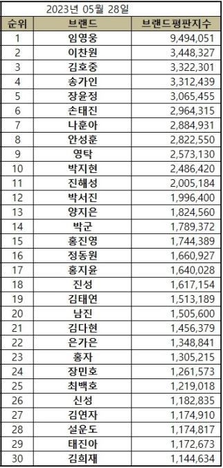 5월 트로트 가수 브랜드평판 30위에는 임영웅, 이찬원, 김호중, 송가인, 장윤정, 손태진, 나훈아, 안성훈, 영탁, 박지현, 진해성, 박서진, 양지은, 박군, 홍진영, 정동원, 홍지윤, 진성, 김태연, 남진, 김다현, 은가은, 홍자, 장민호, 최백호, 신성, 김연자, 설운도, 태진아, 김희재 등이 이름을 올렸다.