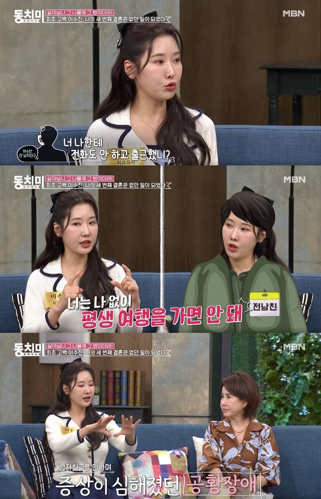 이어 "한번은 저랑 친구가 강원도에 놀러 갔는데 전 남자친구가 '너는 나 없이 평생 여행 가면 안 돼'라고 하더라. 여행 출발 전까지 2박 3일 내내 장문의 카톡을 보내고 매번 전화를 걸었다. 나중에는 제가 전화를 안 받았다. 친구와 리조트에 밤이 됐는데 거기에 따라왔다. 회를 들고 나타났는데 하나도 반갑지 않더라. 여자 둘이 노는 재미가 있고 모처럼의 휴가지 않냐. 그 사람은 미안하다는 말 하나 없었다"고 설명했다.