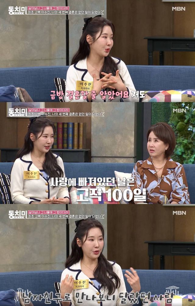 이날 이수진은 "제가 금사빠지 않냐. 저도 (전 남자친구와) 금방 결혼할 줄 알았다. 그런데 딱 100일간 것 같다"라며 "인생은 멀리서 보면 희극이고 가까이서 보면 비극인 것 같다. 가끔 만날 때는 너무 좋았는데 막상 내 연인이 될 사람, 남편이 될 사람으로 만나니까 정말 180도 달랐다"고 말했다.