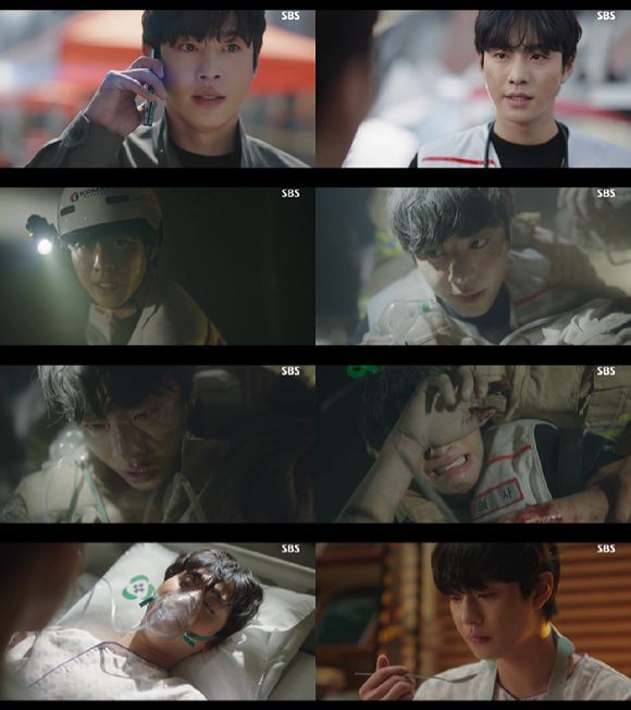 서우진과 박은탁(김민재 분)은 신속하게 응급 처치를 했고 학생들을 무사히 밖으로 내보냈다. 하지만 2차 붕괴가 발생했고 이들은 의식을 잃은 두 명의 환자와 구조대원들이 건물에 다시 갇히는 사태가 일어났다. 이 과정에서 서우진은 환자를 지키다가 철근이 손과 손목을 관통하는 부상을 입었다.