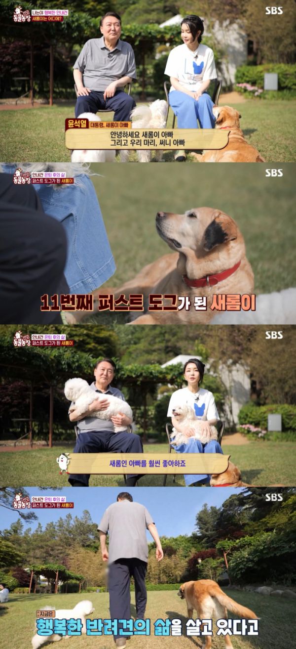 28일 방송된 SBS 'TV 동물농장'에서는 윤석열 대통령 부부와 함께 지내고 있는 은퇴 안내견 '새롬이'의 근황을 공개했다.방송에서 윤석열 대통령은 용산 한남동 관저에서 새롬이 등 반려 동물들과 지내는 모습을 공개하며 자신을 "새롬이 아빠, 그리고 우리 마리, 써니 아빠, 토리 아빠 윤석열입니다"라고 소개했다. 김건희 여사는 "저는 아이들의 엄마 김건희입니다"라고 했다.