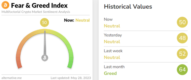 비트코인의 투자심리도 소폭 개선된 모습이다. 이날 암호화폐 데이터 제공 업체 얼터너티브(Alternative)의 자체 추산 '공포·탐욕 지수'는 전날보다 2포인트 오른 50를 기록했다. 다만 '중립' 단계는 유지됐다. 해당 지수는 0에 가까울수록 시장의 '극단적 공포'를 나타내며, 100에 가까울수록 '극단적 낙관'을 의미한다.