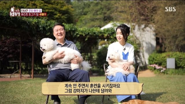 윤 대통령 부부는 28일 방송된 SBS 'TV동물농장' 1122회에 출연해 지난해 크리스마스 때 입양한 맹인 안내 은퇴견 '새롬이'와 함께 서울 한남동 관저 곳곳에서 시간을 보내는 모습을 공개했다.
