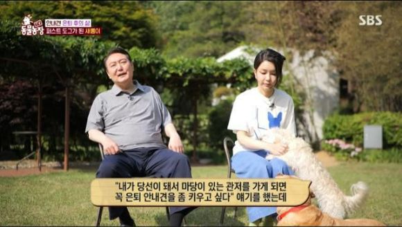 SBS 프로그램인 'TV 동물농장'은 이날 방송에서 시각장애인 안내견의 일생을 다루면서 윤 대통령 부부와 관저 마당에서 뛰어노는 반려견 새롬이를 소개했다. 2013년생 래브라도 레트리버인 새롬이는 시각장애인 김한숙씨와 6년여간 지내다 은퇴한 안내견으로, 지난해 크리스마스에 윤 대통령 부부의 11번째 반려동물로 입양됐다.