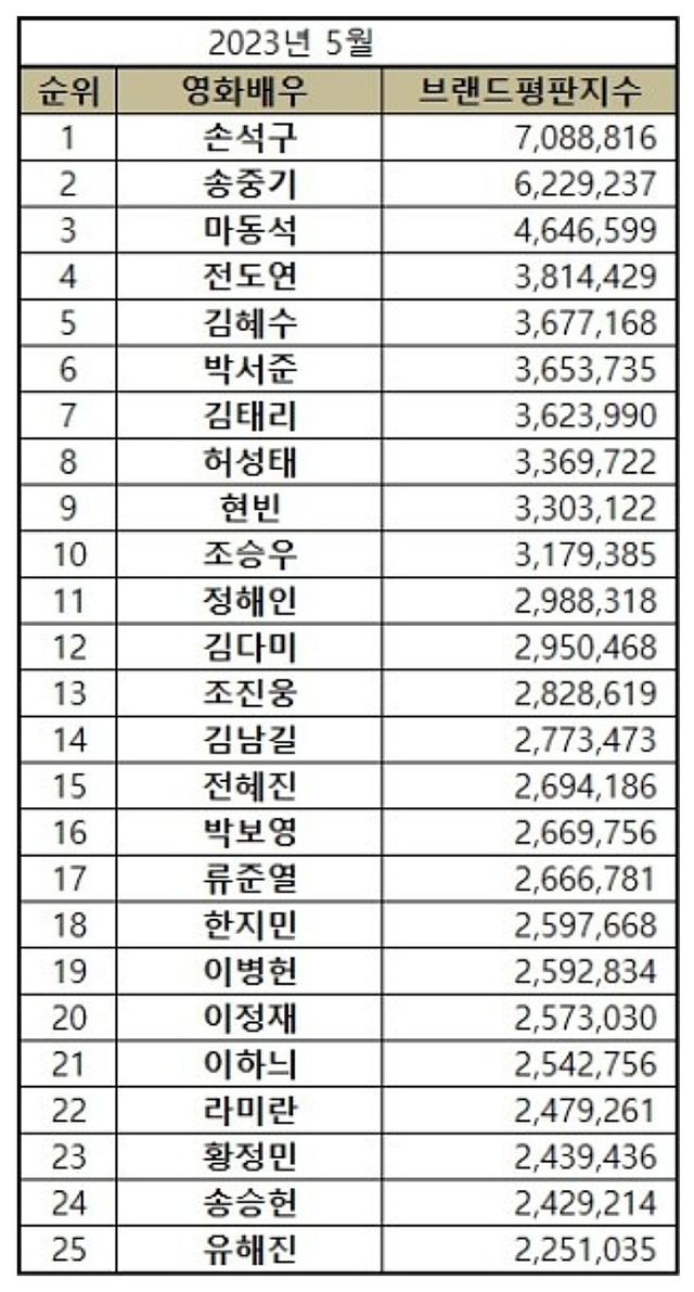 2023년 5월 영화배우 브랜드평판 상위 25위는 손석구, 송중기, 마동석, 전도연, 김혜수, 박서준, 김태리, 허성태, 현빈, 조승우, 정해인, 김다미, 조진웅, 김남길, 전혜진, 박보영, 류준열, 한지민, 이병헌, 이정재, 이하늬, 라미란, 황정민, 송승헌, 유해진 순으로 분석됐다.