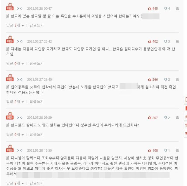 일부 해외 매체와 네티즌의 글을 본 국내 네티즌들은 “한국어 할 줄 아는 흑인을 더빙 시켰어야 한다는 거냐”, “자기들이 다인종 국가라고 한국도 다인종 국가인줄 아나”, “한국말 잘 하고 노래 잘 하는 흑인이 한국에 있기는 있냐”, “다니엘이 부른 노래 조회 수가 할리 베일리 노래보다 더 높을 때부터 저런 말 나올 것 같았다”라고 비판했다.
