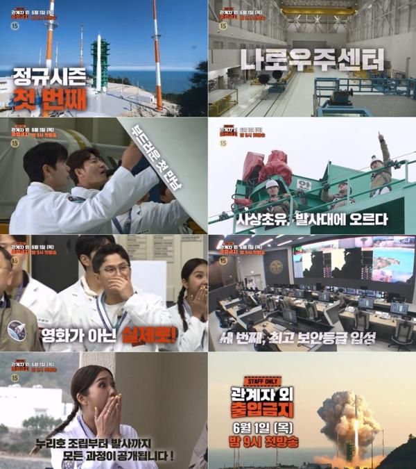 또한 로켓이 발사되는 발사대에 직접 오르는 사상 초유의 경험을 한 김종국과 양세형은 "죽인다여기"라며 단전에서 끌어올린 찐리액션을 터뜨려 '관계자 외 출입금지'를 통해 방송 최초로 공개될 '로켓 발사대 뷰'에 궁금증을 자아낸다. 또한 예고 영상 말미에는 김종국, 양세형, 이이경, 미미가 눈길을 끄는데, 미지의 공간에 들어서자 "여기가 영화에서 보던 그곳"이냐며 놀라워하고 있다. 이것은 최고 보안등급 구역인 '발사지휘센터'에 입성한 것이다.