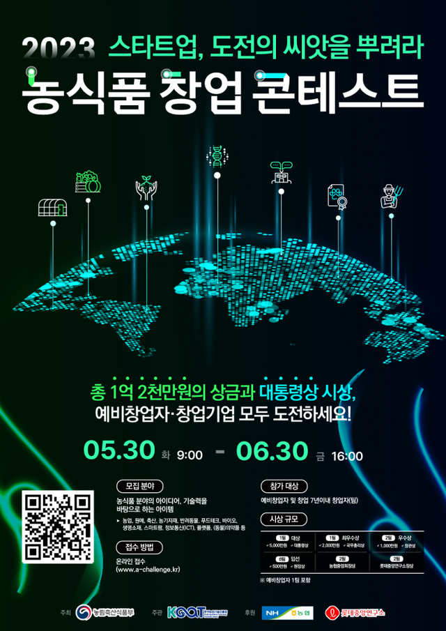 농림축산식품부(장관 정황근, 이하 농식품부)는 농업의 미래를 이끌어 갈 유망 창업기업을 발굴하기 위하여 2023년 5월 30일부터 6월 30일까지 ‘2023년 농식품 창업콘테스트’ 참가자를 모집한다.